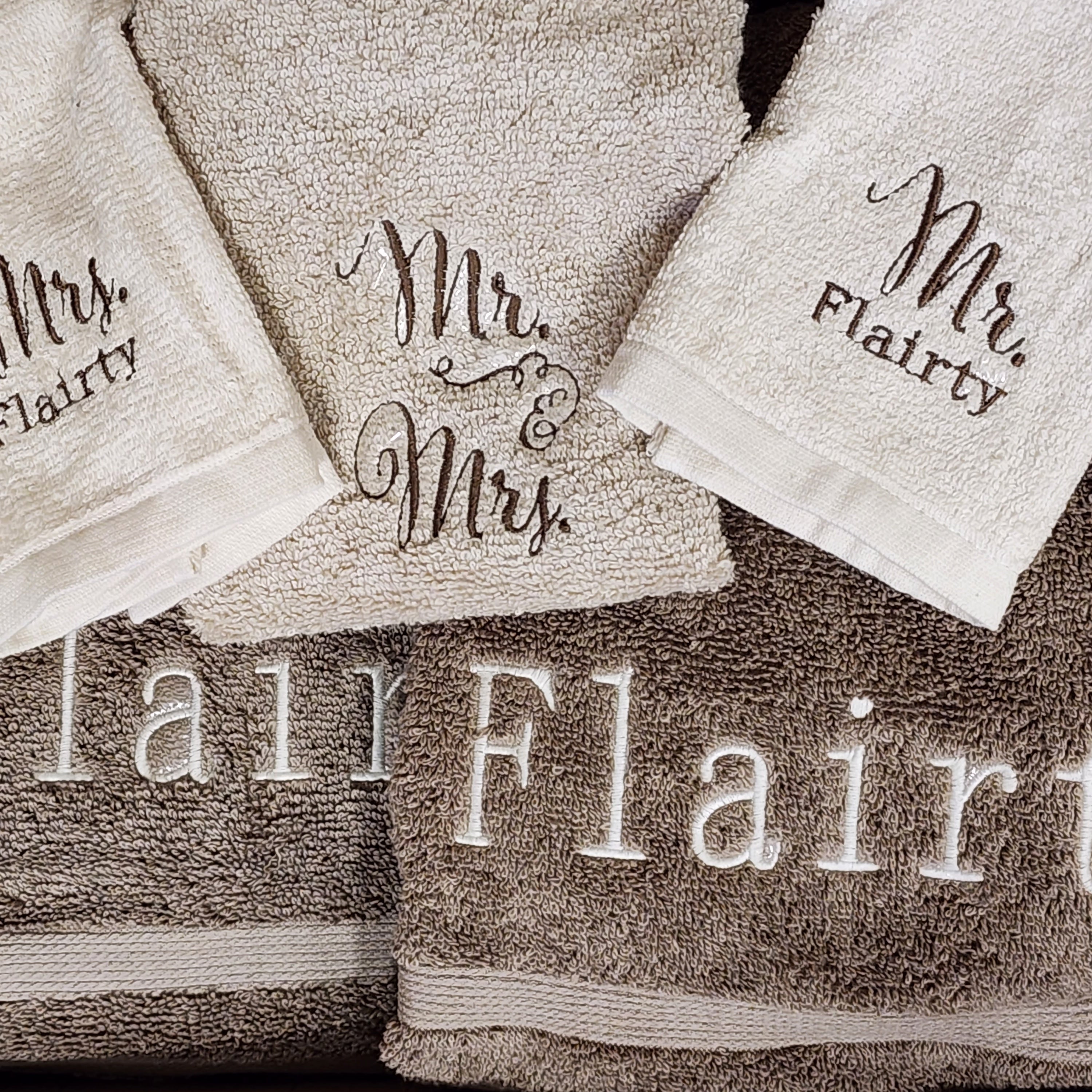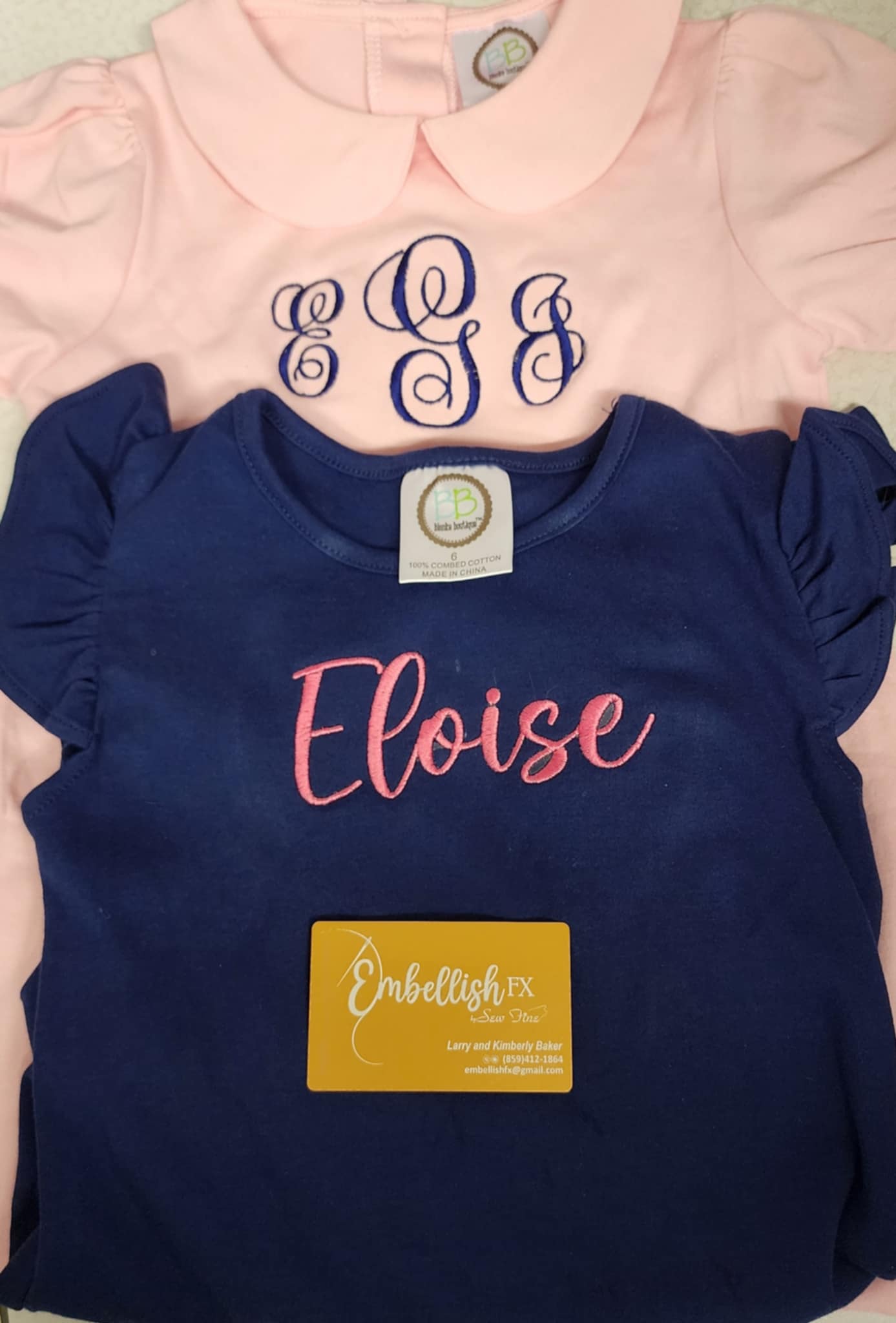 Perfect for gifts (i.e., baby, wedding, etc.), monograms, spirit wear and custom apparel for everyday life whether embroidery, screen printing (DTF) or laser. We've got you covered!